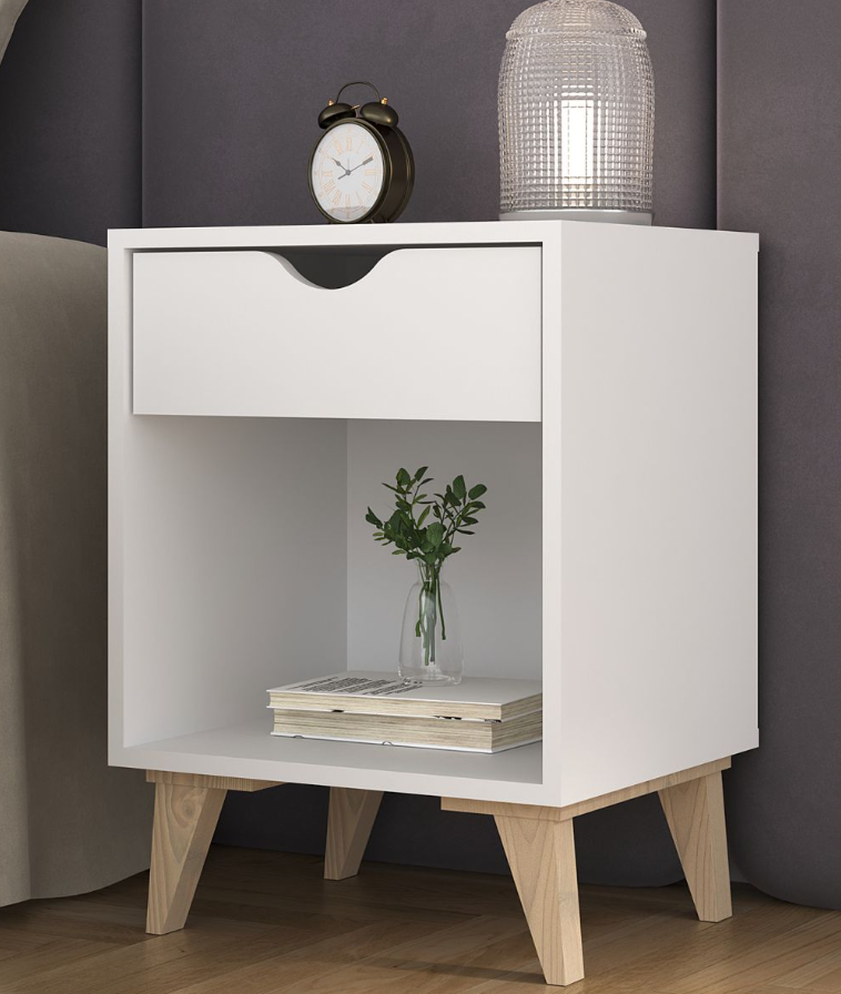 Dimensiones de base compactas, un cajón y estante librero es todo lo que necesitas al lado de la cama. Combinala con la Mesa de Luz Silah si prefieres más cajones para guradado fuera de la vista!