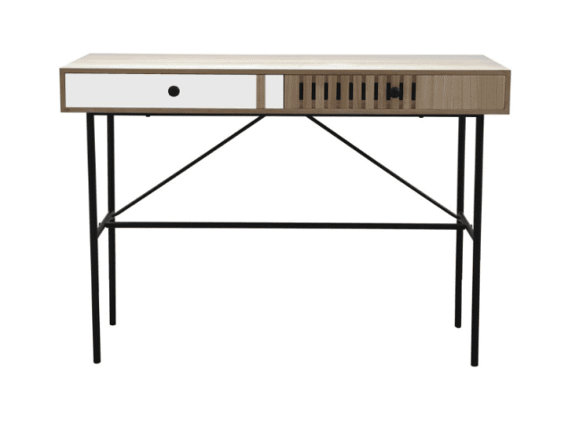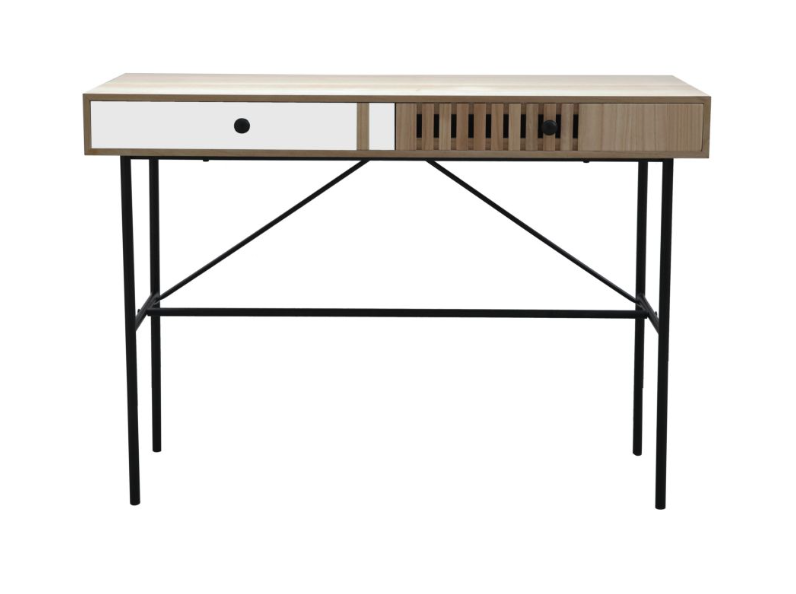 Mesa de arrime en madera de Paulownia y MDF con patas de acero de líneas minimalistas. Sus dimensiones le dan la versatilidad de poder ser usado también como escritorio