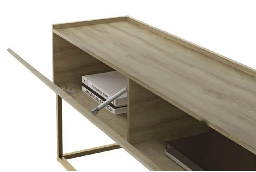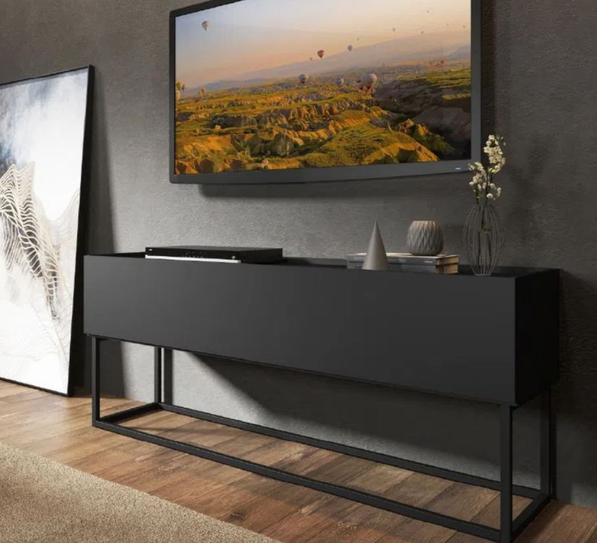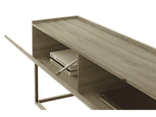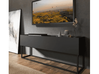 El Rack para TV Sinai es una es una pieza funcional de estilo contemporáneo con aire Industrial. Su tapa frontal basculante con pistón a gas da acceso a un amplio y discreto espacio de guardado fuera de la vista, perfecto para elementos de uso diario, colaborando en la organización del ambiente.