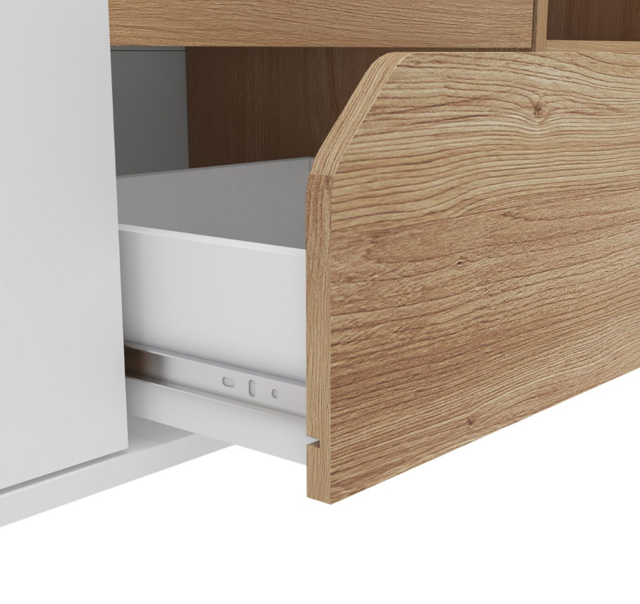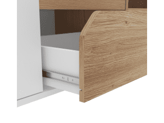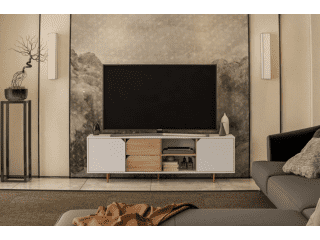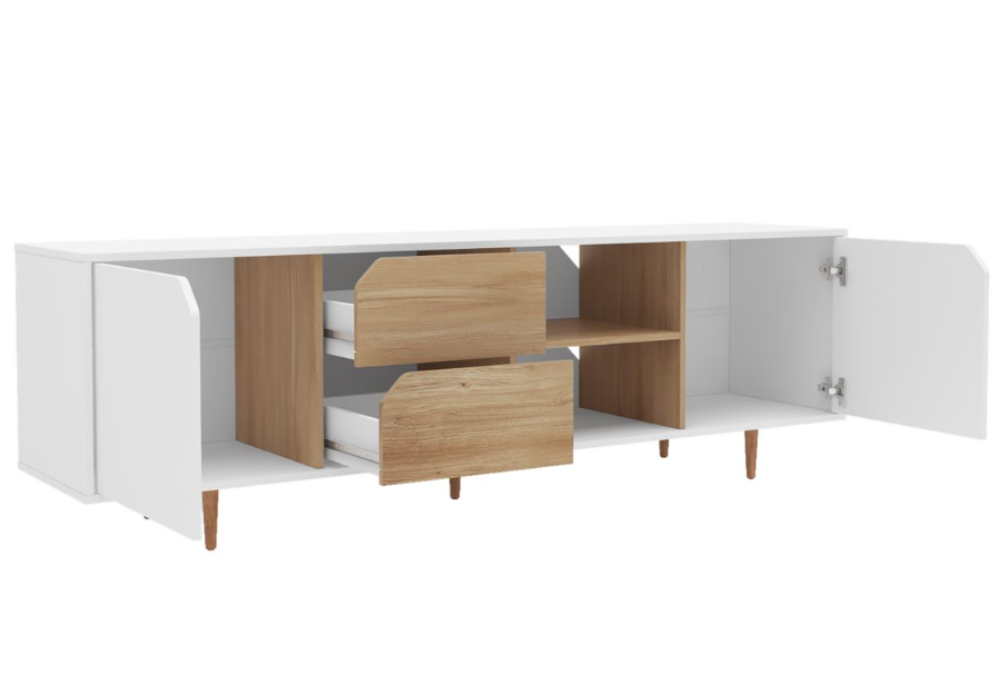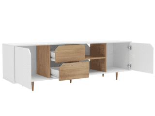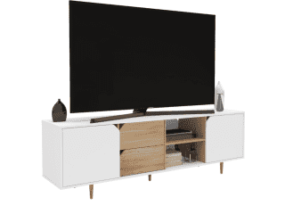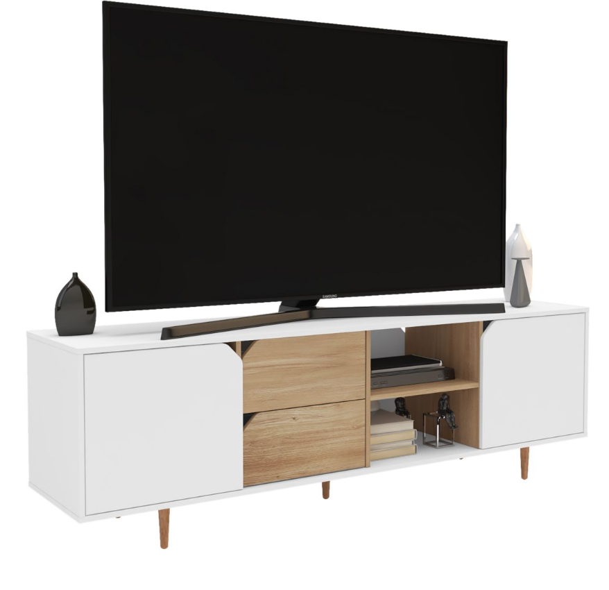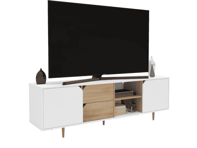 Rack para TV combinado en blanco y madera. Gran capacidad de guardado, 2 puertas, 2 cajones y 1 estante a la vista perfecto para elementos multimedia. Levanta tu sala de estar y optimiza espacios reducidos.