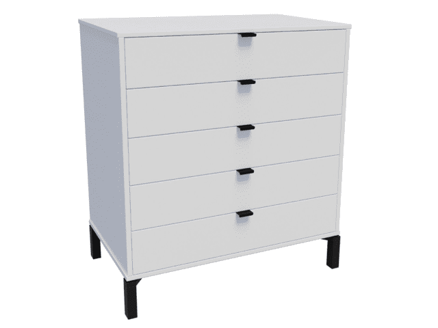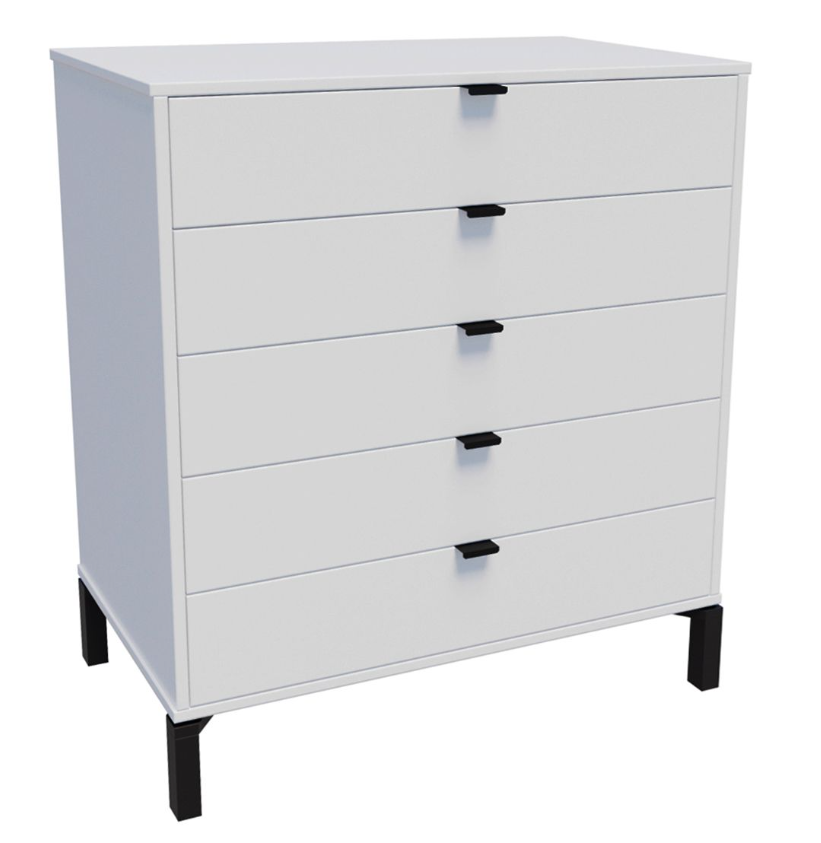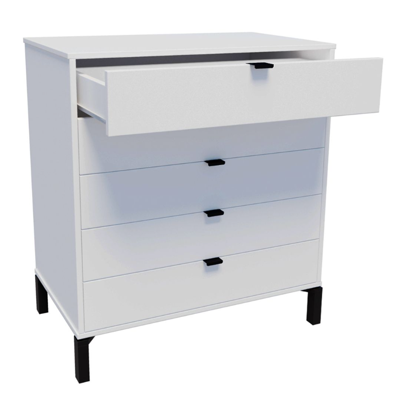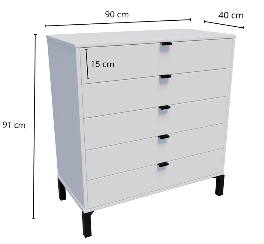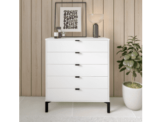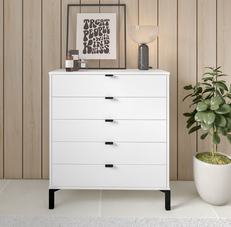 La cómoda Marden de 5 cajones es todo lo que necesitas si buscas practicidad, diseño y calidad en una sola pieza. Su estructura vertical, fabricada en MDP con contrachapado melamínico, garantiza resistencia y durabilidad, mientras que los tiradores metálicos y las patas de madera en negro le aportan un toque moderno y elegante.