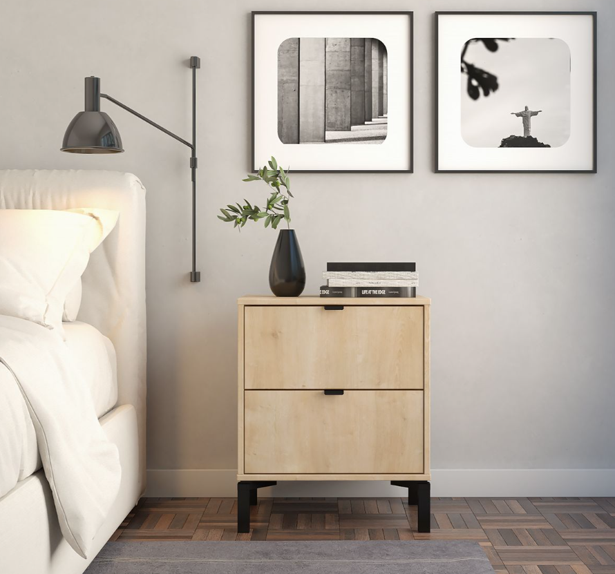 Esta mesa de luz tiene todo lo que necesitás: diseño moderno, altura ideal para camas más altas y cajones amplios para guardar todo eso que querés bien a mano y bien guardado a la vez. Fabricada en MDP con contrachapado melamínico, rieles telescópicos para un deslizamiento suave, patas en madera y tiradores metálicos, ambos detalles en color negro, aportan carácter y estilo con un toque de sofisticación. Una pieza funcional, simple y con mucha onda que eleva el estilo de tu dormitorio.